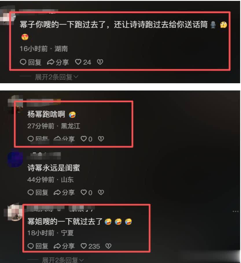 还有的表示:“杨幂跑啥啊,嗖一下的就跑过去了,还让刘诗诗跑过去,给你送话筒”。