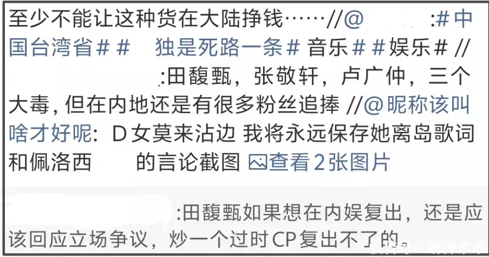难怪网友会呼吁对田馥甄等人抵制到底呢……炒了一圈,音乐播放平台粉丝涨了,再来内地活动被举报也有人洗白了,再不济也能靠着内地炒作的热度拿资源了。