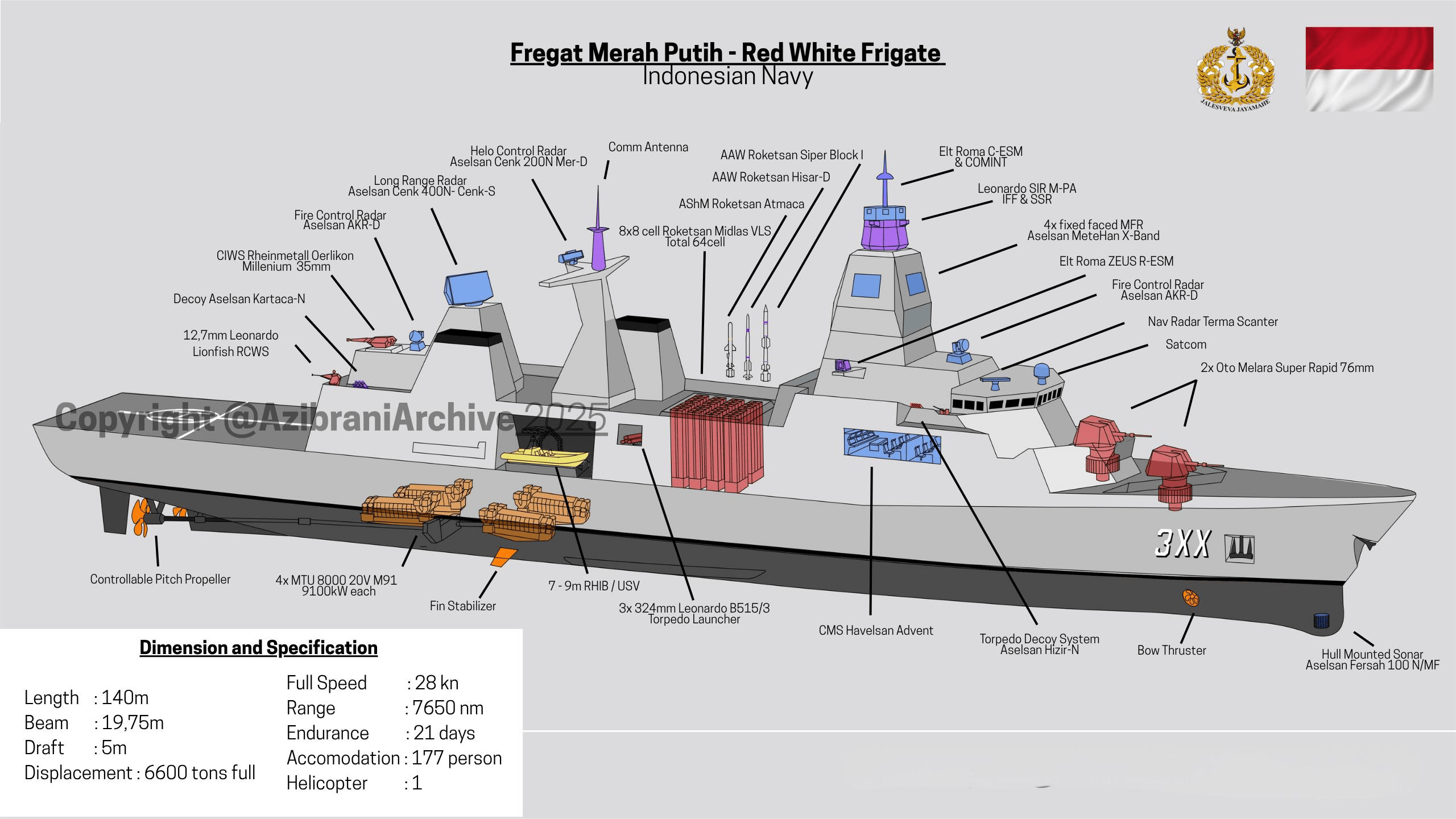 先从基础平台配置看,两型舰艇均展现出全球重型护卫舰的发展趋势,通过大型化船体提升综合性能。“红白”级全长143.57米、宽19.7米、吃水5米,标准排水量约6000吨,满载排水量可达6600吨,采用复合柴油机(CODAD)动力配置,四台单机功率9100千瓦的MTU 20V 8000 M71柴油发电机组,总轴马力接近4.9万马力,最大航速28节,18节巡航状态下续航里程达9000海里,足以支撑印尼在远海长时间巡逻的需求,实现从巽他海峡至霍尔木兹海峡的不间断航行。