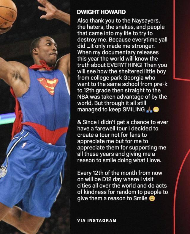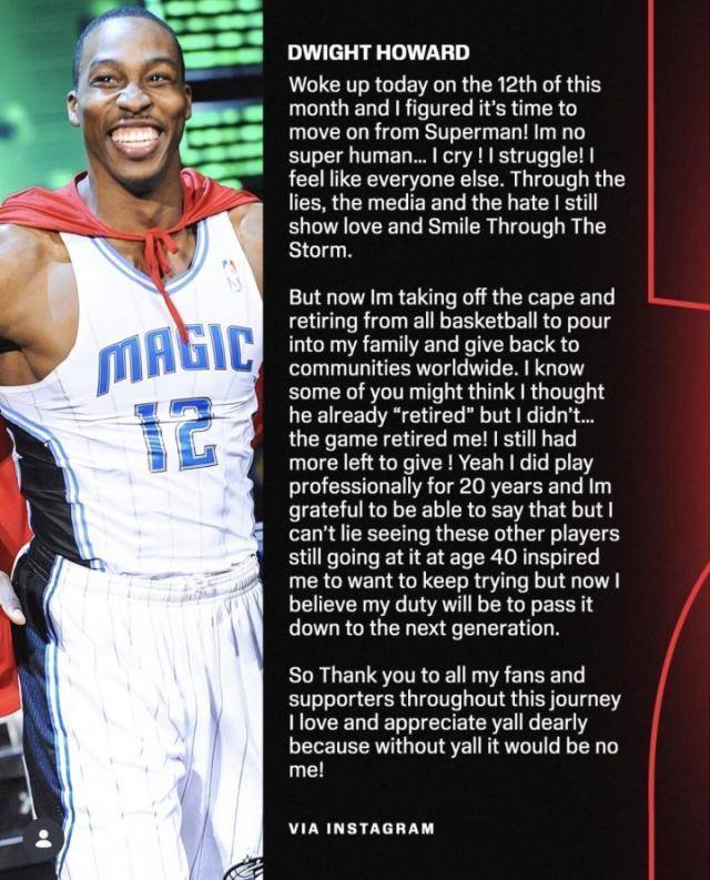 3月13日,40岁的前NBA球星德怀特·霍华德在社媒发表长文宣布正式退役。霍华德生涯曾先后效力于魔术、湖人、火箭、老鹰、黄蜂、奇才、湖人、76人、湖人和中国台湾联赛云豹。
