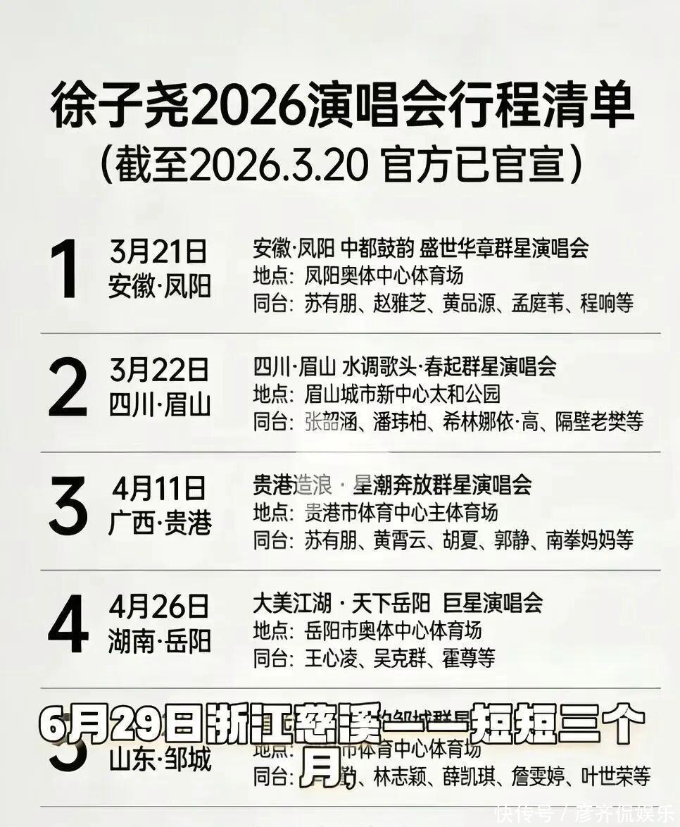 就在近日,有知情人士曝光了徐子尧未来的演出计划,我们可以清楚的看到接下来的3月份,4月份,5月份,6月份,她都有演唱会,且同台演出的都是华语乐坛的知名歌手,包括但不限于苏有朋,张韶涵,王心凌,潘玮柏等。