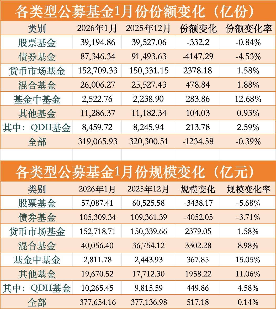 截至今年1月末,公募基金整体份额达到31.91万亿份,相比2025年12月末下降0.39%;公募基金整体规模达到37.77万亿元,环比增长0.14%。在份额出现微幅缩水的情况下,依靠净值增长,规模保持正增长。