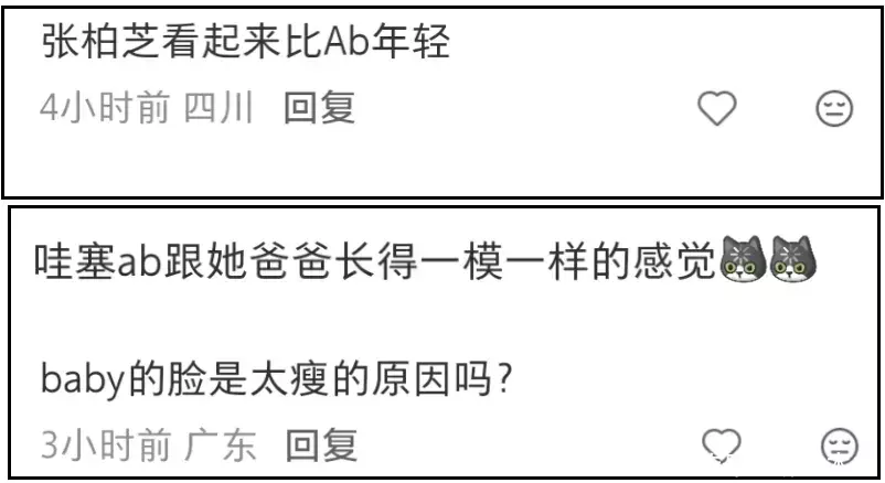 再来就是张柏芝和baby的审美取向差异了,张柏芝偏好面部饱满,好处是显年轻,就是容易显肿显僵,baby专注追求五官立体,只是年纪上来了,太瘦会显得干瘪疲惫,还会变得男相,看到网友吐槽baby越来越像她爸爸了。