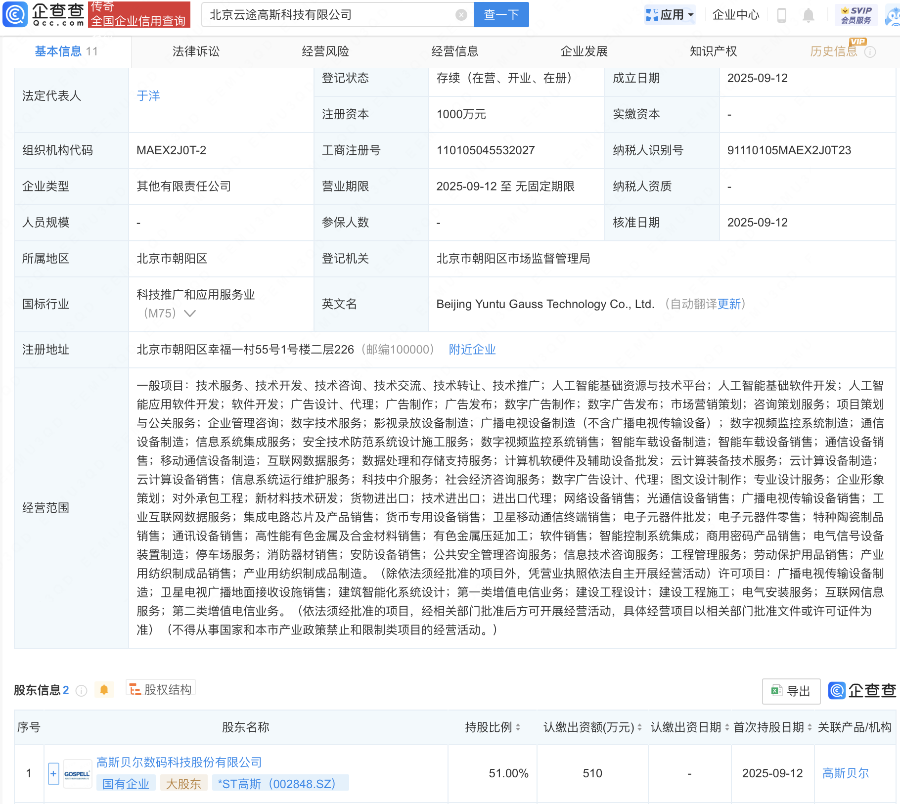 近日手机配资软件,北京云途高斯科技有限公司成立,经营范围包含:人工智能基础资源与技术平台;人工智能基础软件开发;人工智能应用软件开发等。企查查股权穿透显示,该公司由*ST高斯(002848)等共同持股。